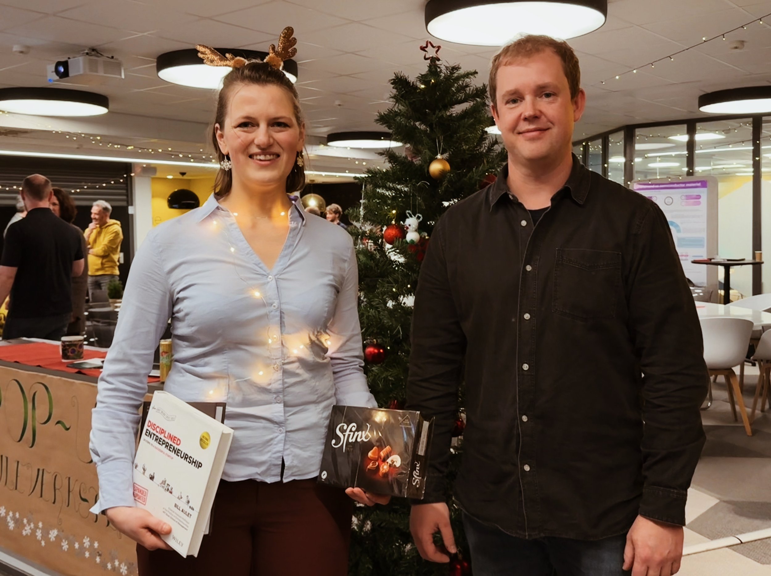 Audience Award winners at the TILT Researcher Christmas Pitch — receiving a signed copy of Disciplined Entrepreneurship by Bill Aulet.