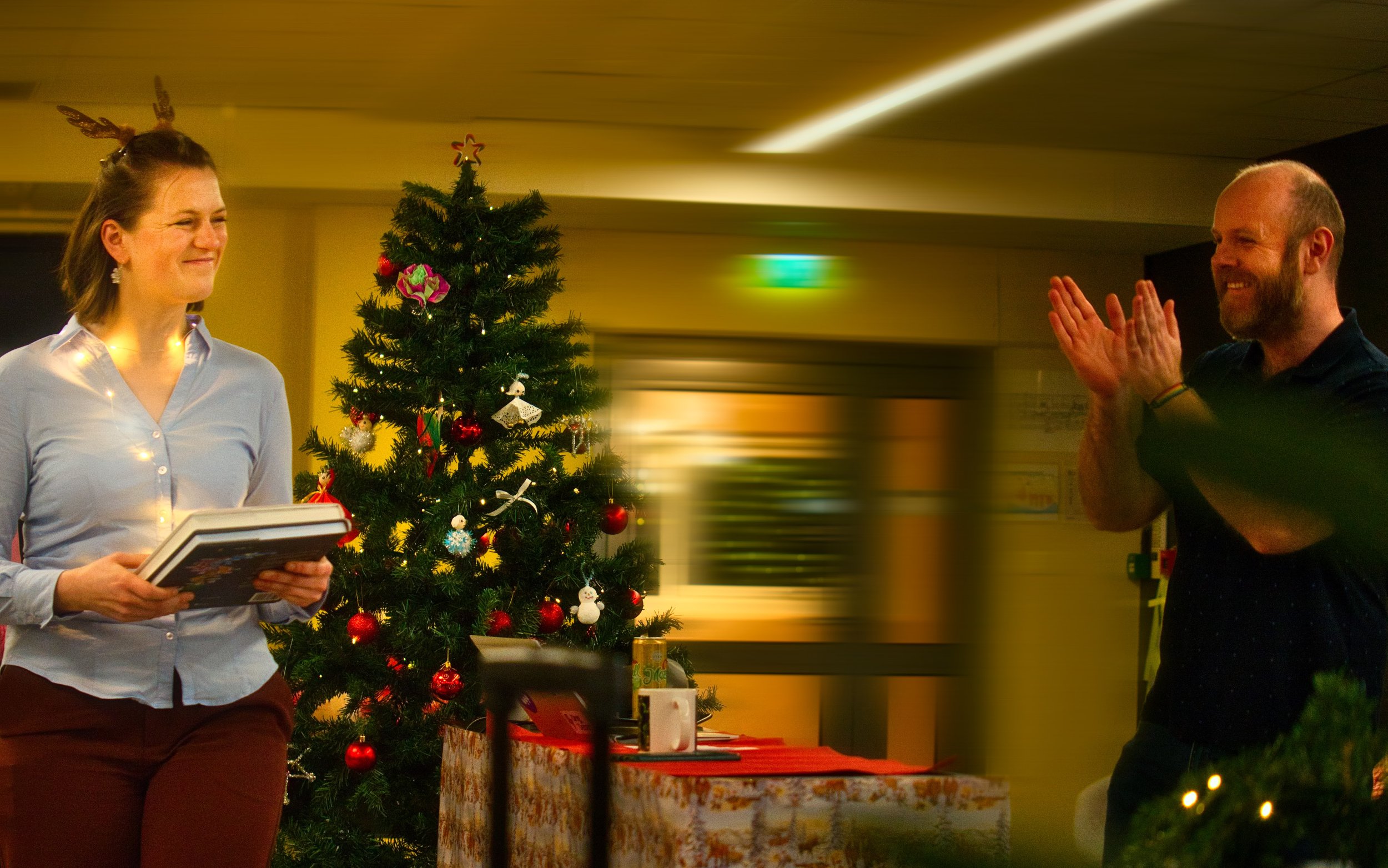 Pitch moment at the TILT Researcher Christmas Pitch, where Katharina won the price for bringing holiday spirit to the room.