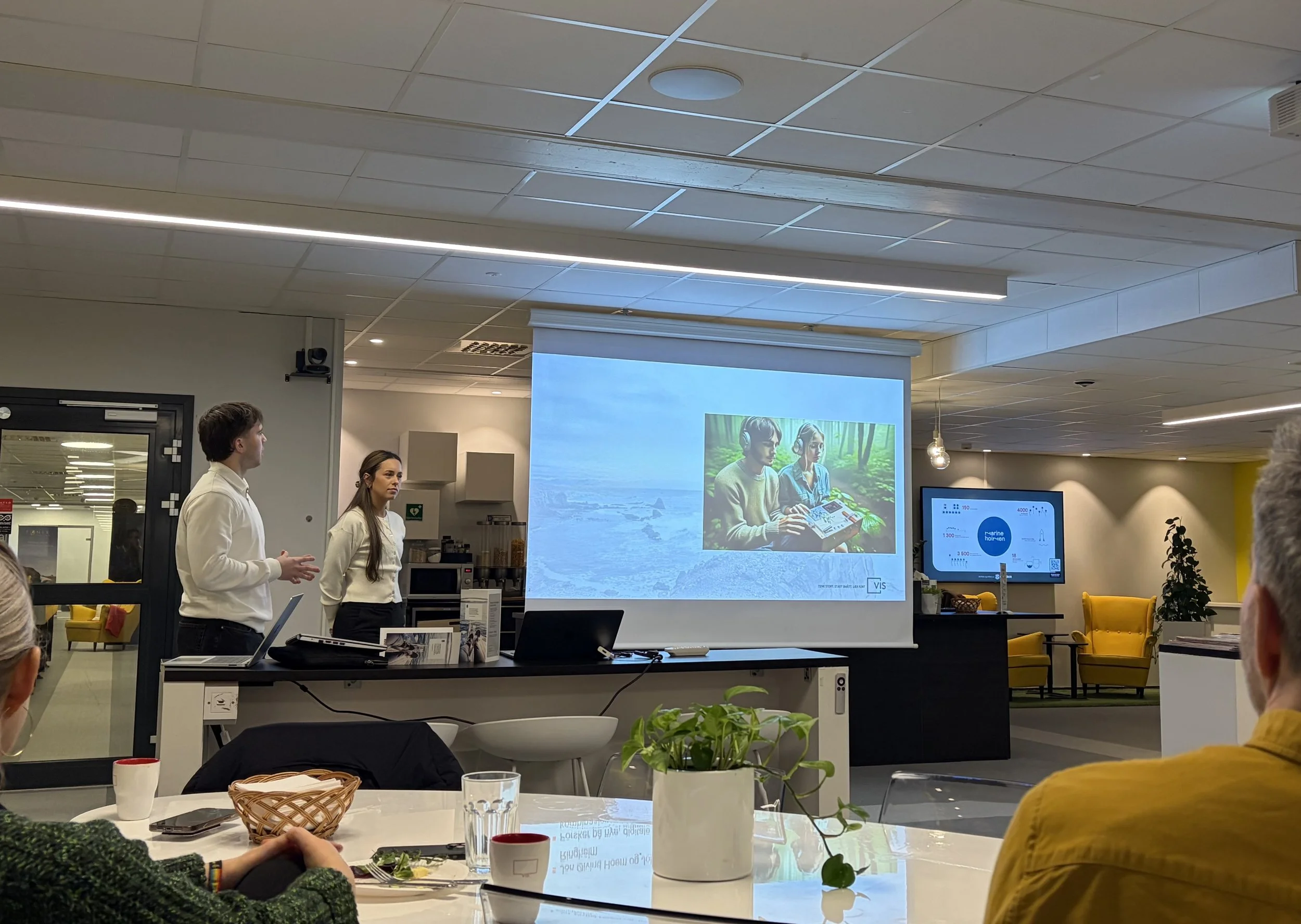 Praksisstudentene Hedda og Andreas presenterer et TTO-prosjekt under Frokostlauget hos VIS.